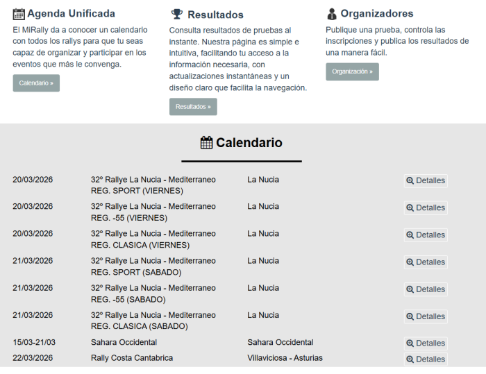 Share via Share via... Twitter LinkedIn Facebook Pinterest Telegram WhatsApp Yammer Reddit TeamsCambios recientesSend via e-MailImprimirEnlace permanente × Calendario En esta página encontramos el calendario de Rallys que utilizan MiRally para su cronometraje. Muchos participantes utilizan esta página para buscar nuevas pruebas a las que inscribirse. es/mirally/portal-mirally/calendario.txt Última modificación: 2026/03/26 08:40por joan