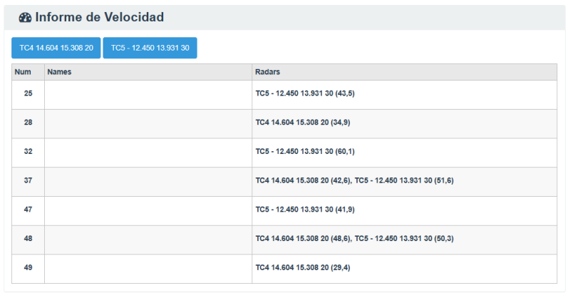 En esta ventana podemos ver los participantes que no han respetado la velocidad en las zonas de radar virtual, por lo cual serán sancionados con la penalización establecida en el radar. Podemos ver las penalizaciones totales por radares en la pantalla Tiempos PCs, en el tramo zRadar.