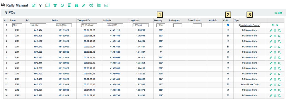 - Bearing: indica la dirección. Si dentro del radio del PC hay un cambio de dirección respecto al primer punto de entrada hay que ajustar el bearing manualmente. Si los PCs están hechos con Roadbook Designer el bearing ya es correcto.