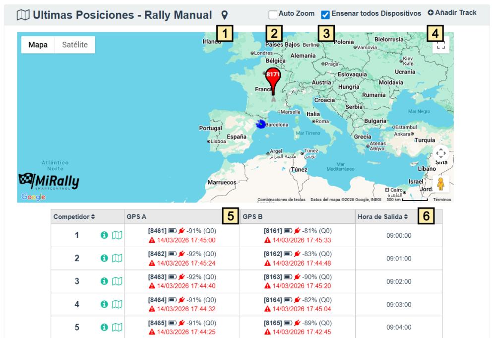 Esta pantalla es muy importante durante el rally. Nos permite controlar el estado de los GPSs y la posición de los participantes en tiempo real.